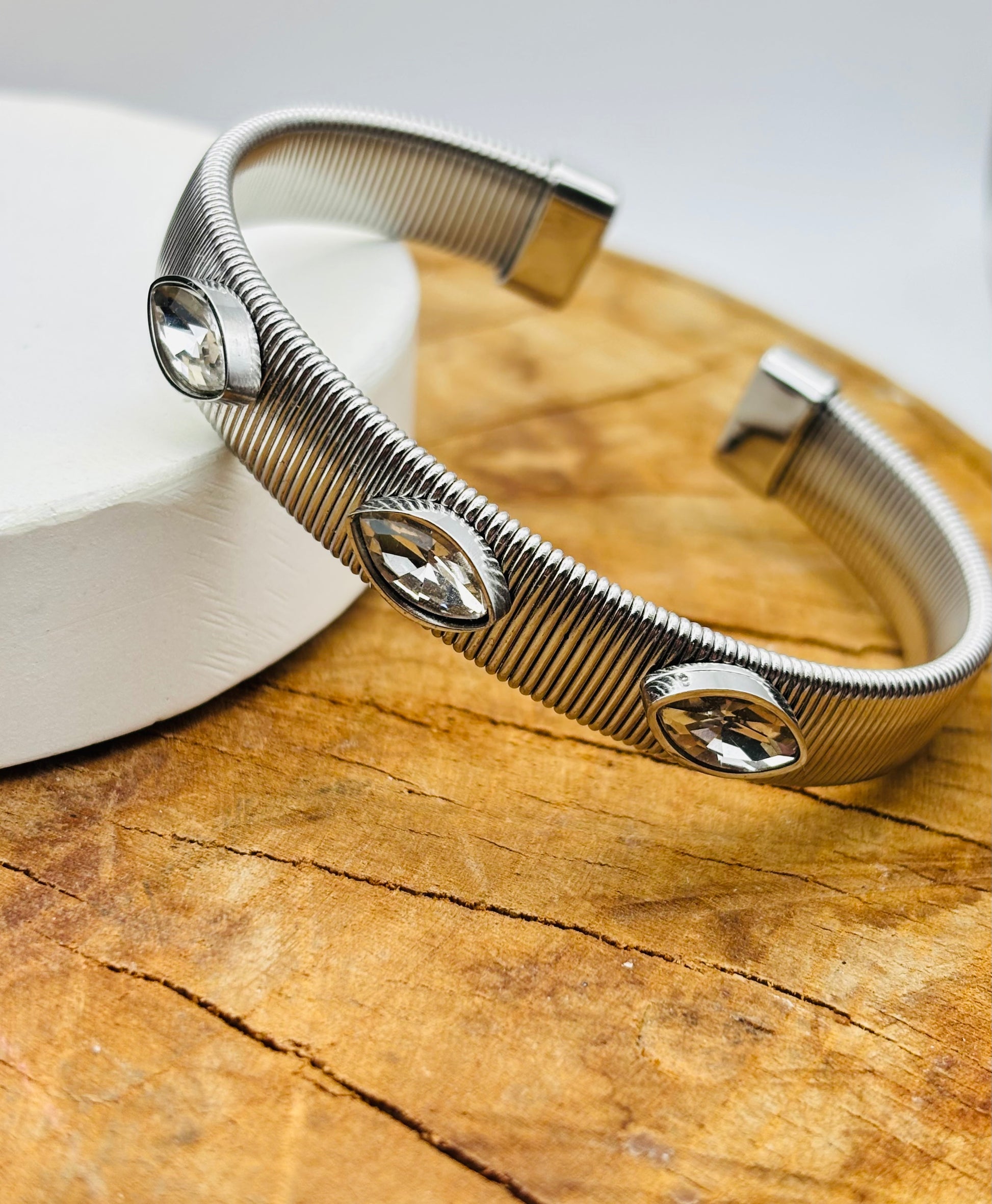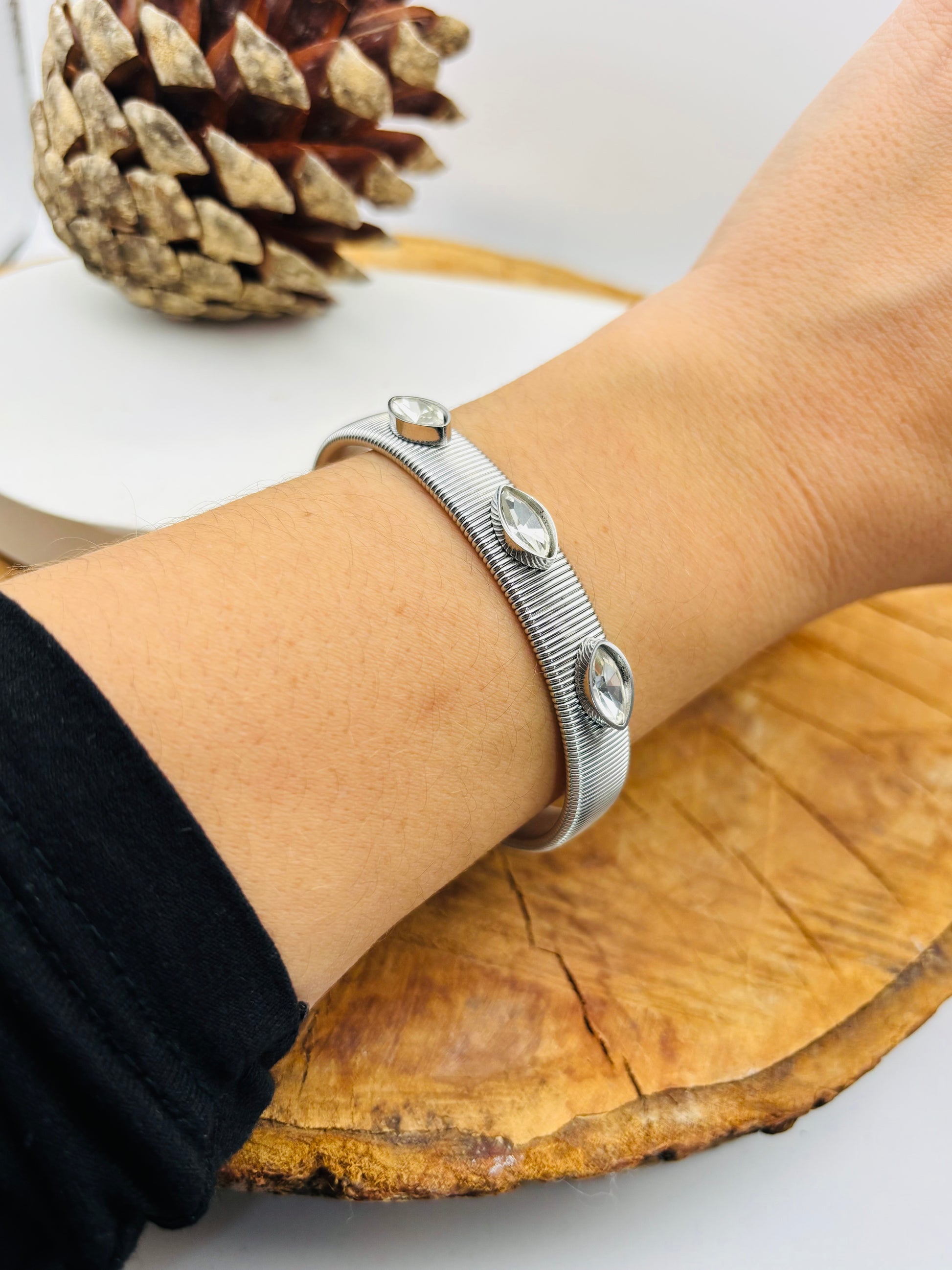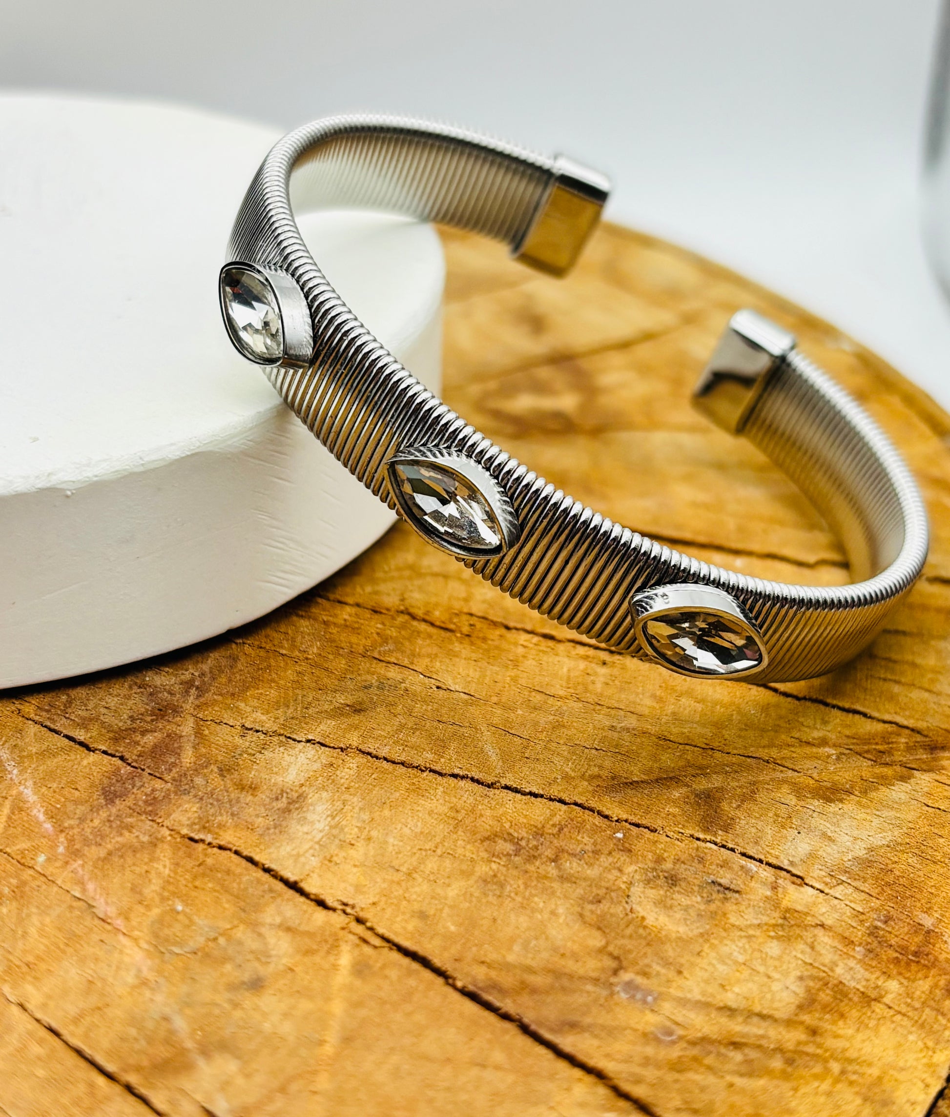 Ατσάλινο βραχιόλι χειροπέδα με υπέροχα ζιργκον χρώμα ασημί!
