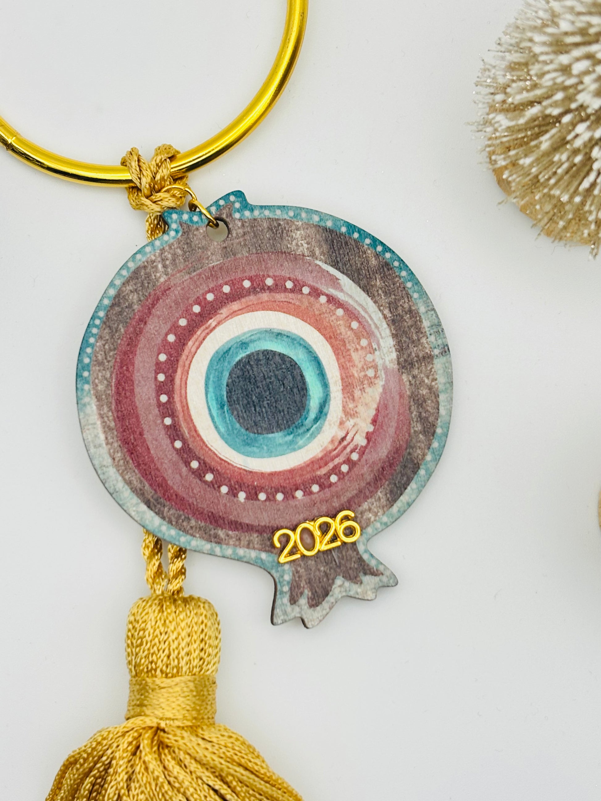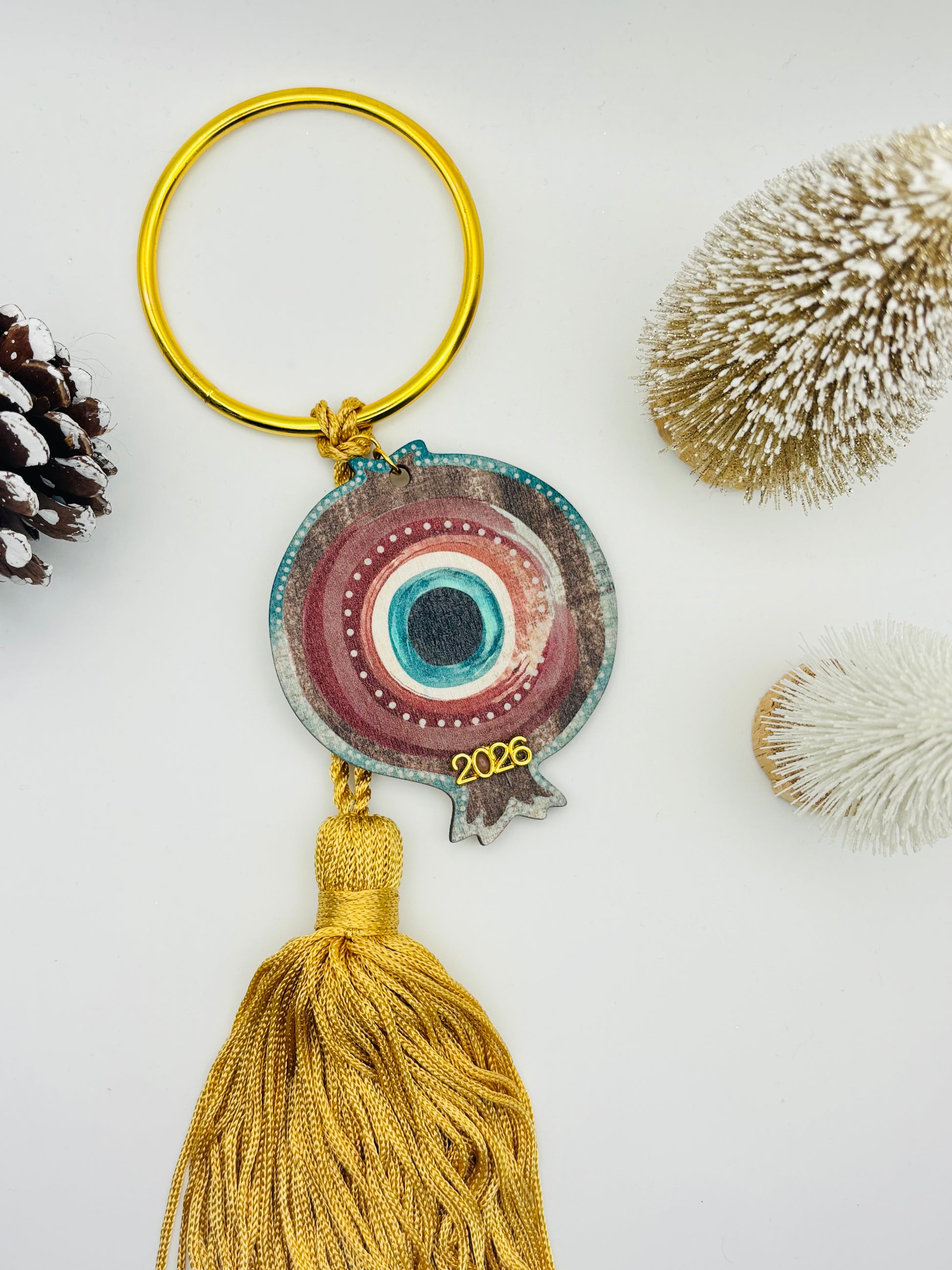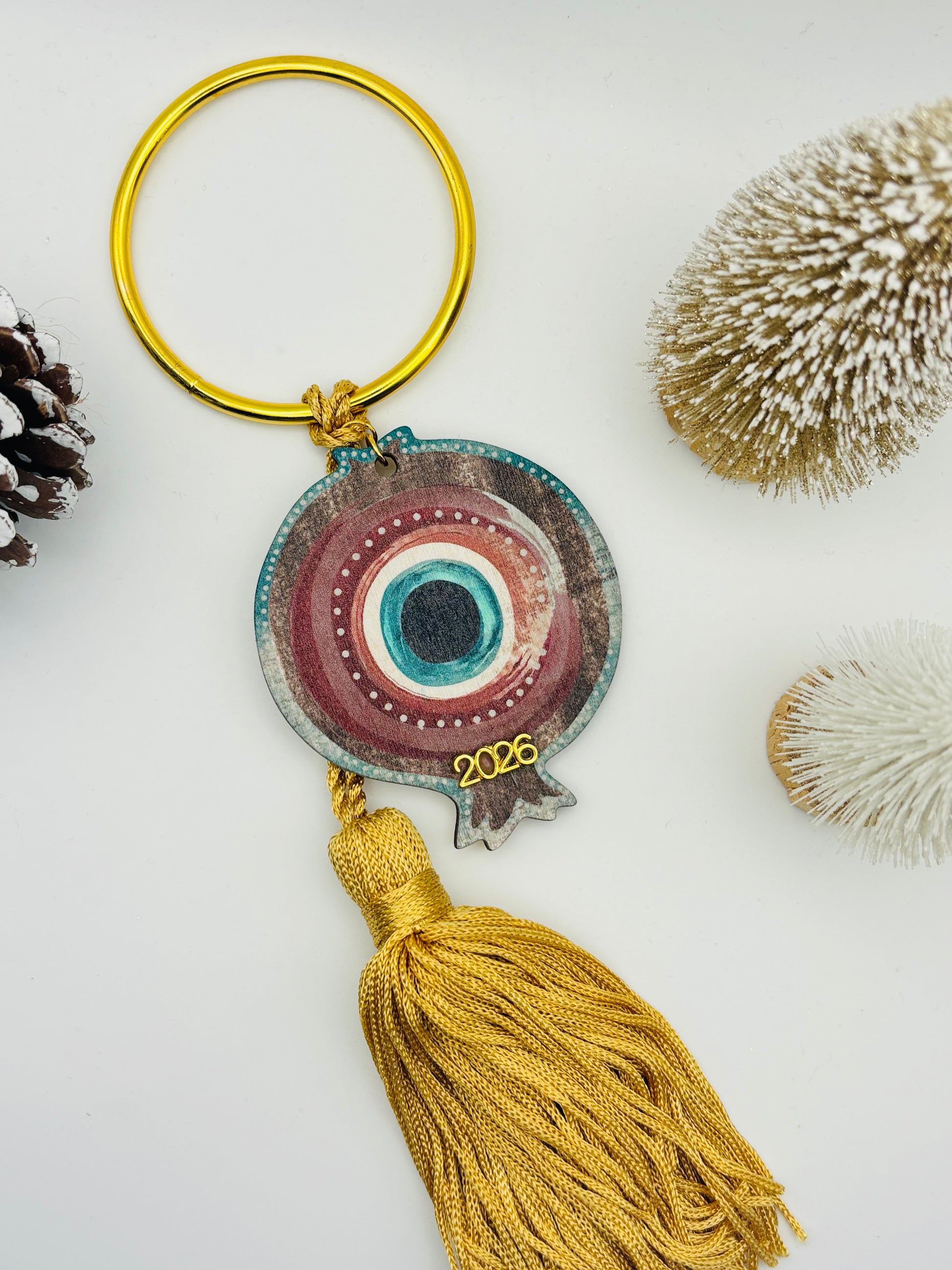 Χειροποίητο κρεμαστό γούρι με ξύλινο μοτίφ μάτι και φούντα χρυσή!