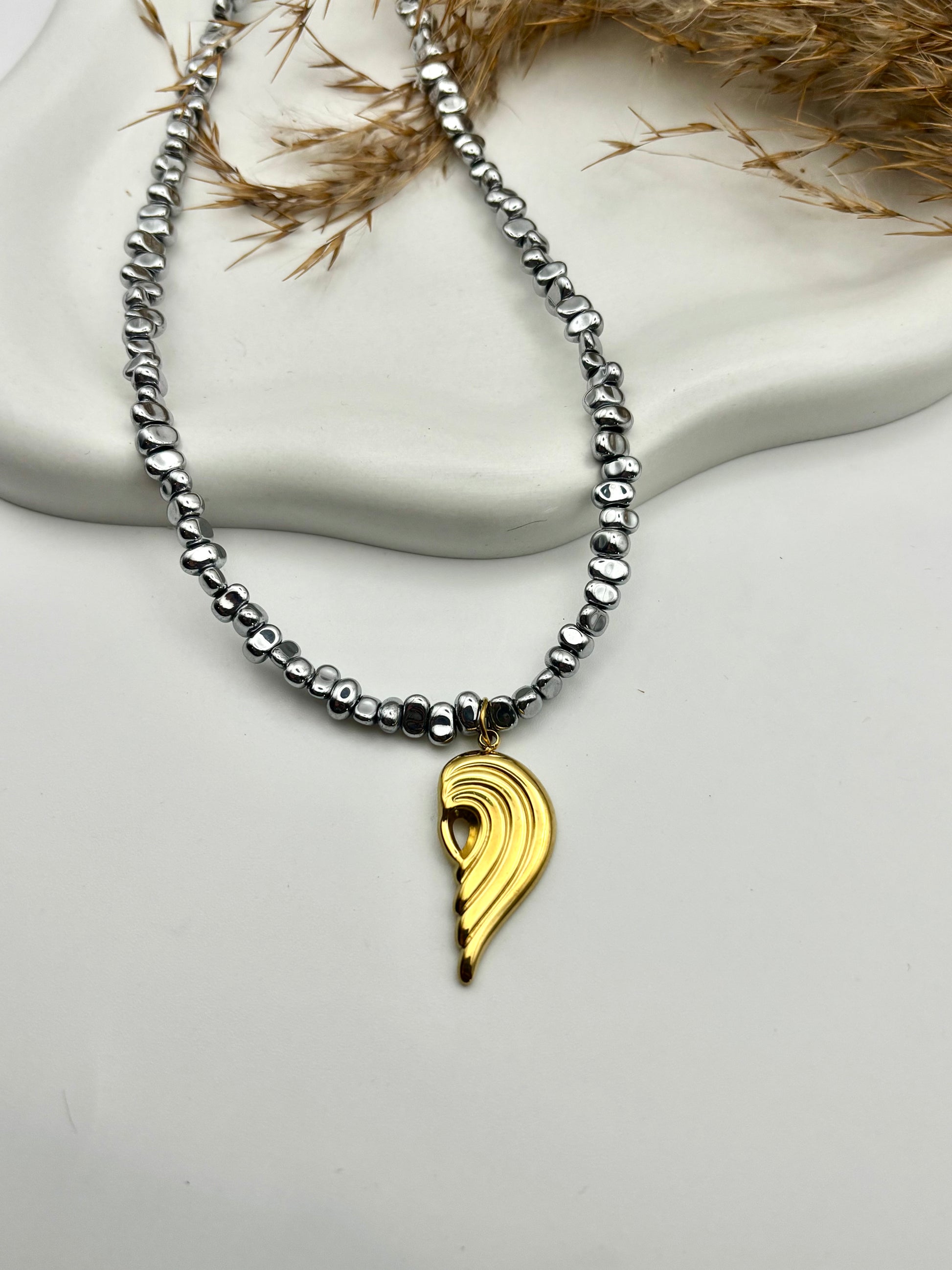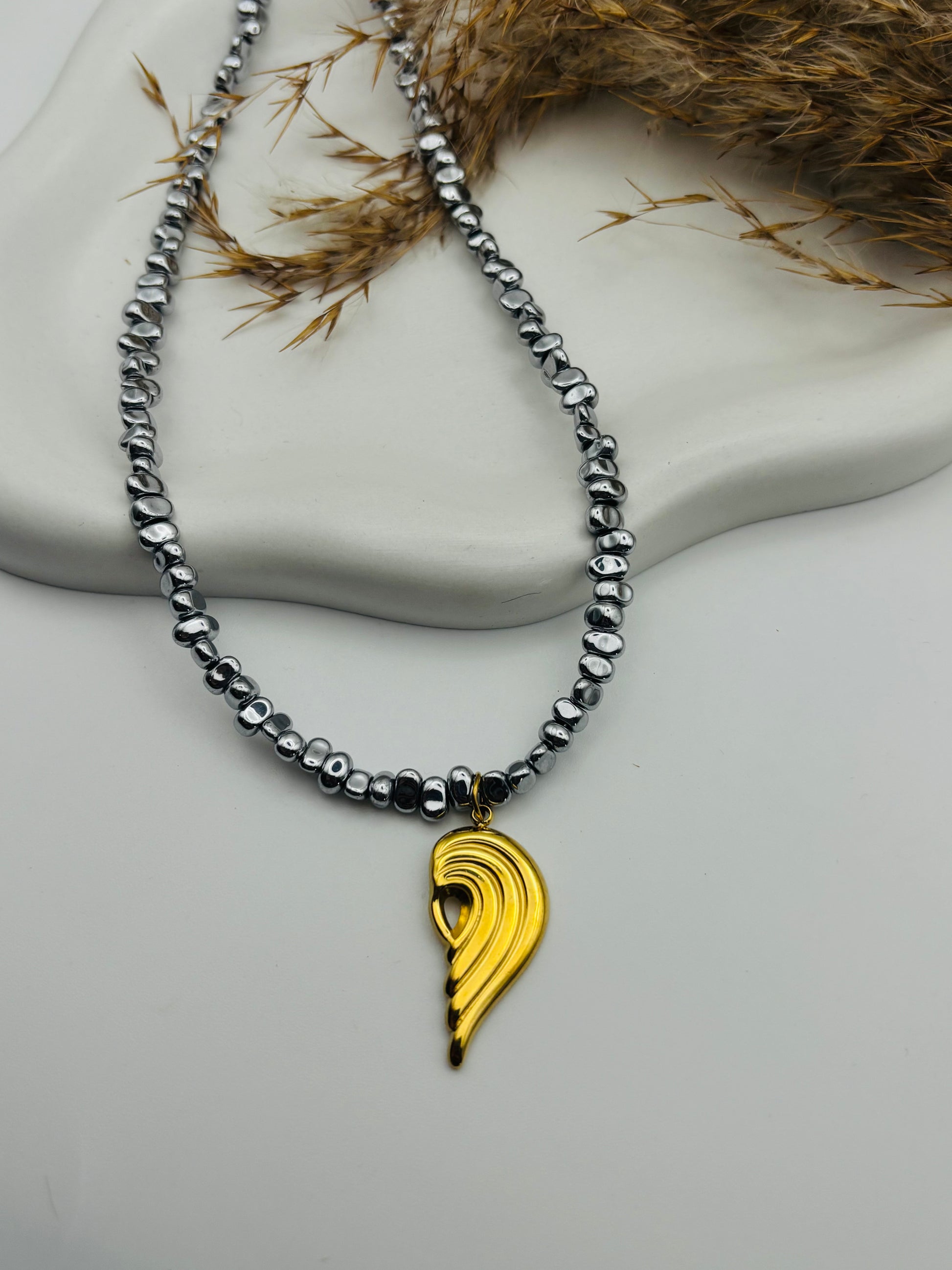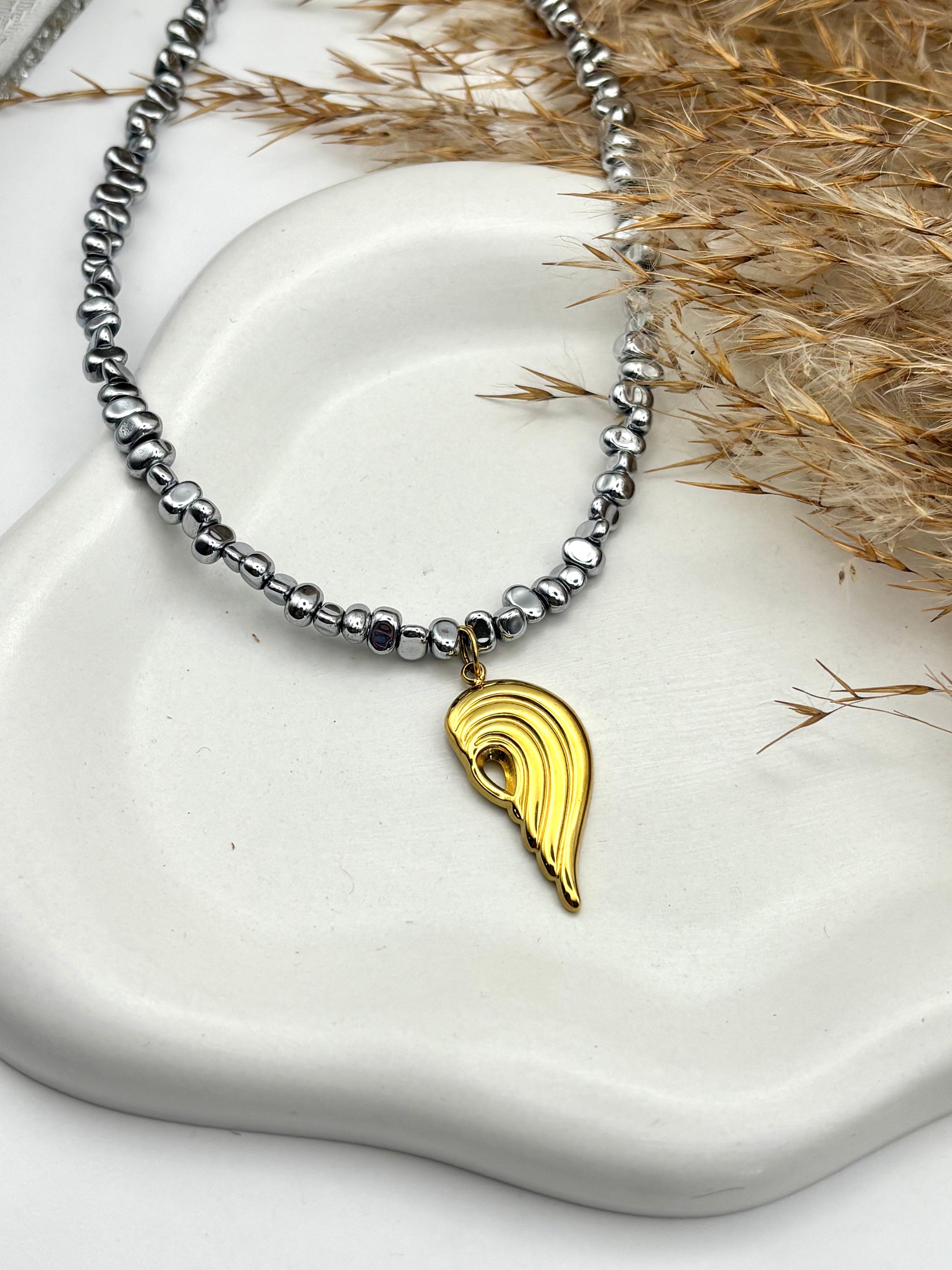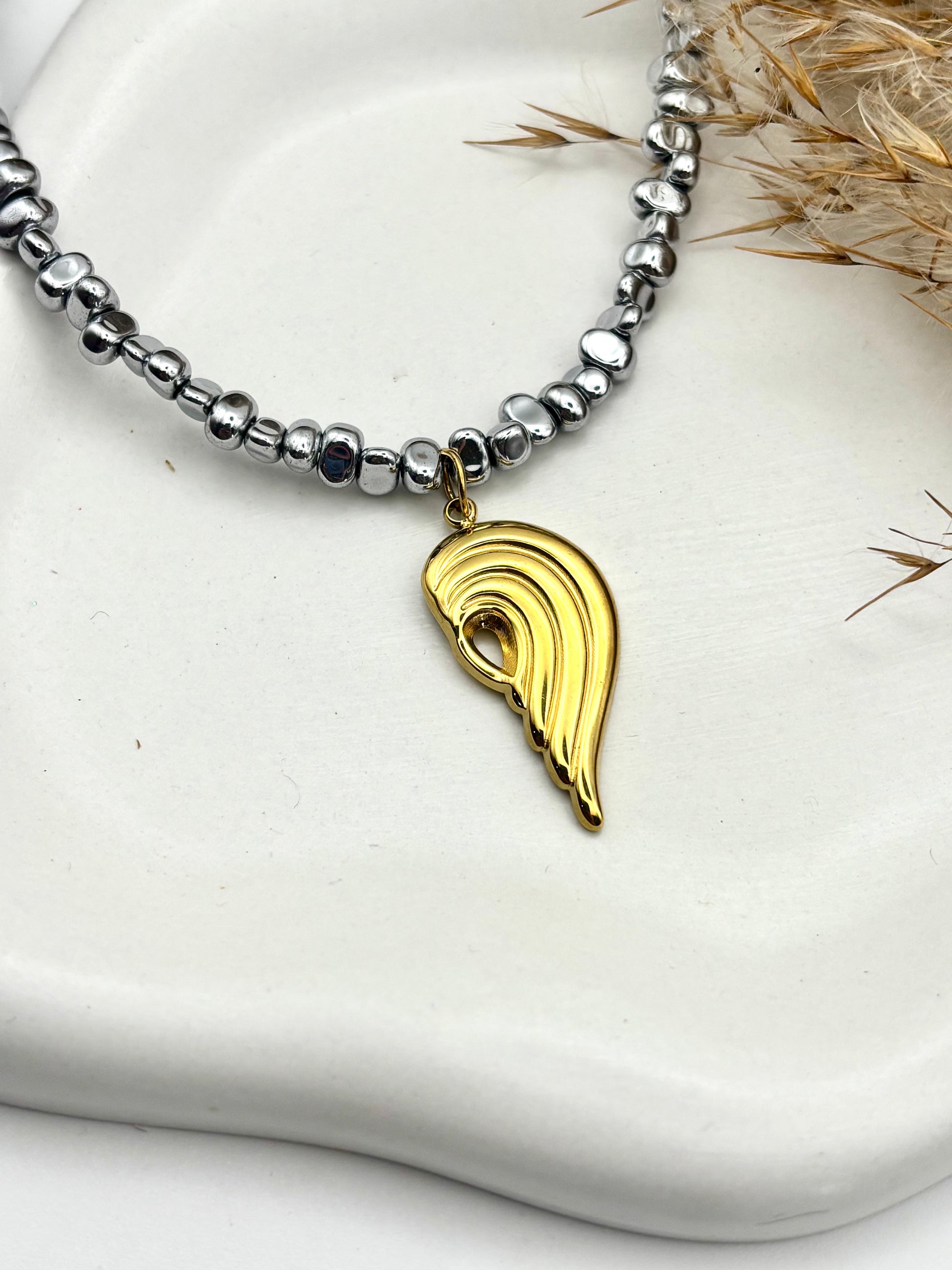 Χειροποίητο κολιέ από αιματίτη με υπέροχο κρεμαστό ατσάλινά μοτι φτερό άγγελου!!