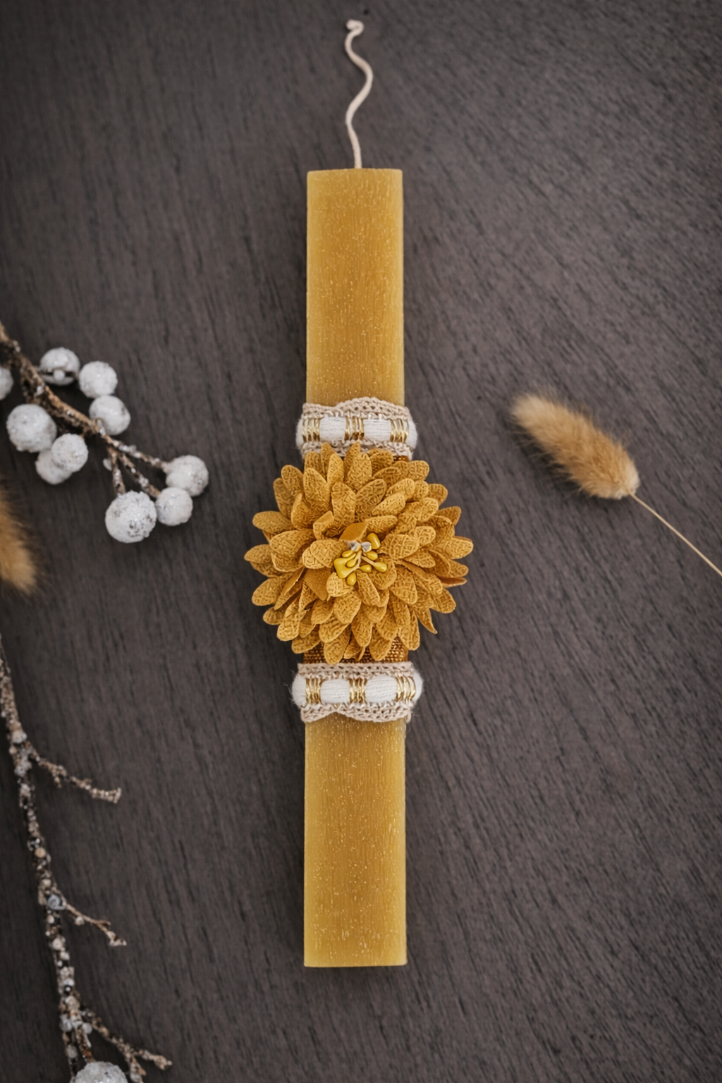 Χειροποίητη πασχαλινή λαμπάδα με λουλούδι, minimal σχεδιασμό και κομψή αισθητική. Ιδανική για γυναίκες που αγαπούν τη φύση και την κομψότητα.