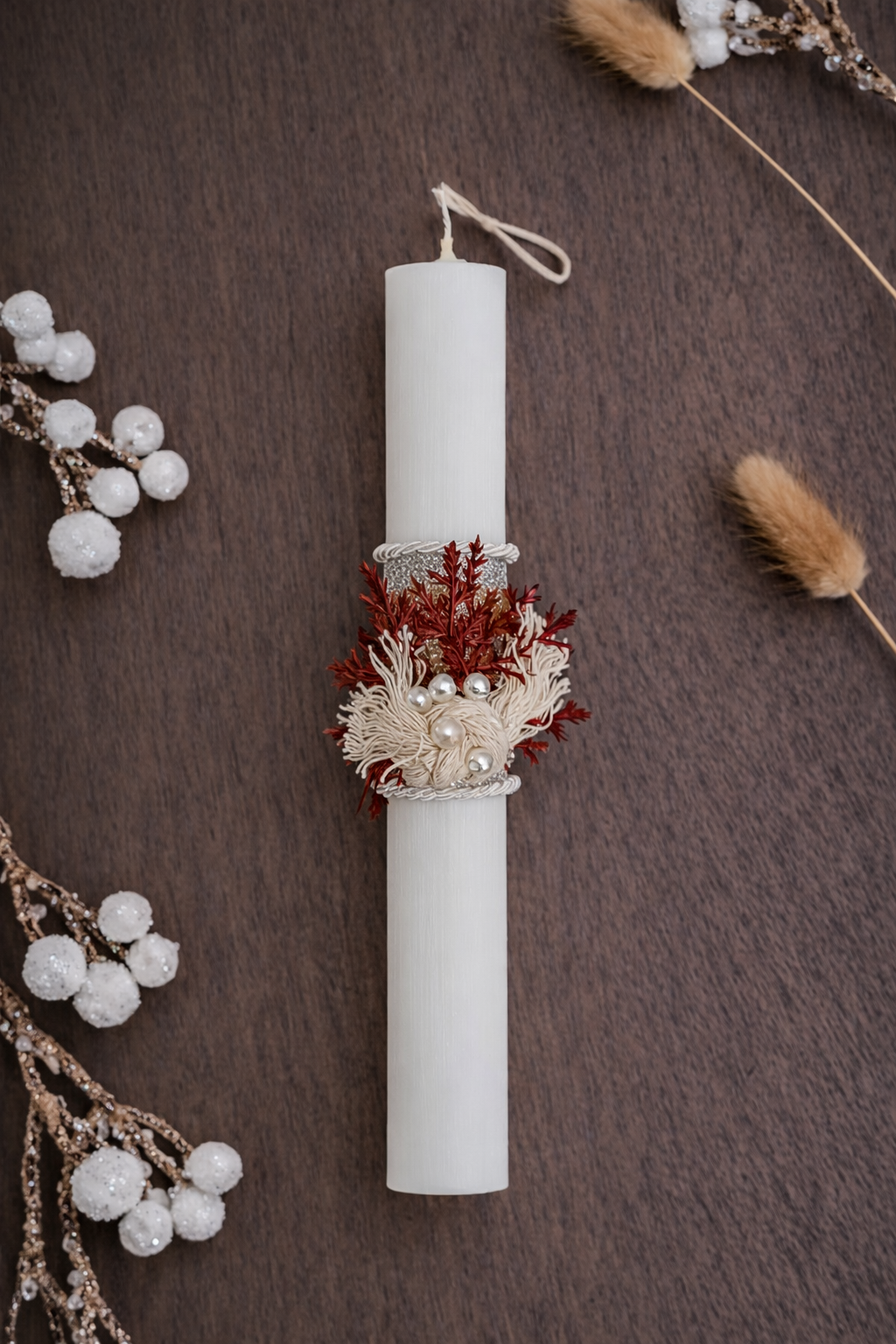 Χειροποίητη πασχαλινή λαμπάδα με λουλούδια και πέρλα, minimal σχεδιασμό και πολυτελή αισθητική. Ιδανική για εκλεπτυσμένες γυναίκες.
