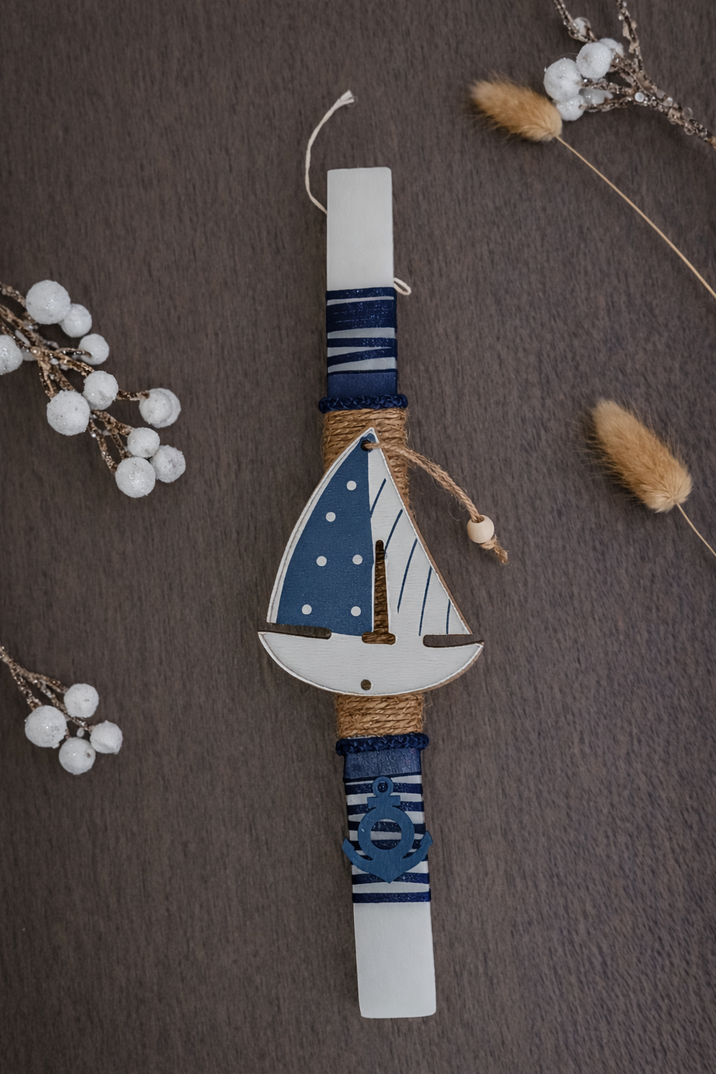 Χειροποίητη παιδική λαμπάδα με καραβάκι, minimal σχεδιασμό και μοντέρνο στυλ. Ιδανική για δώρο Πάσχα που θα ενθουσιάσει κάθε παιδί.