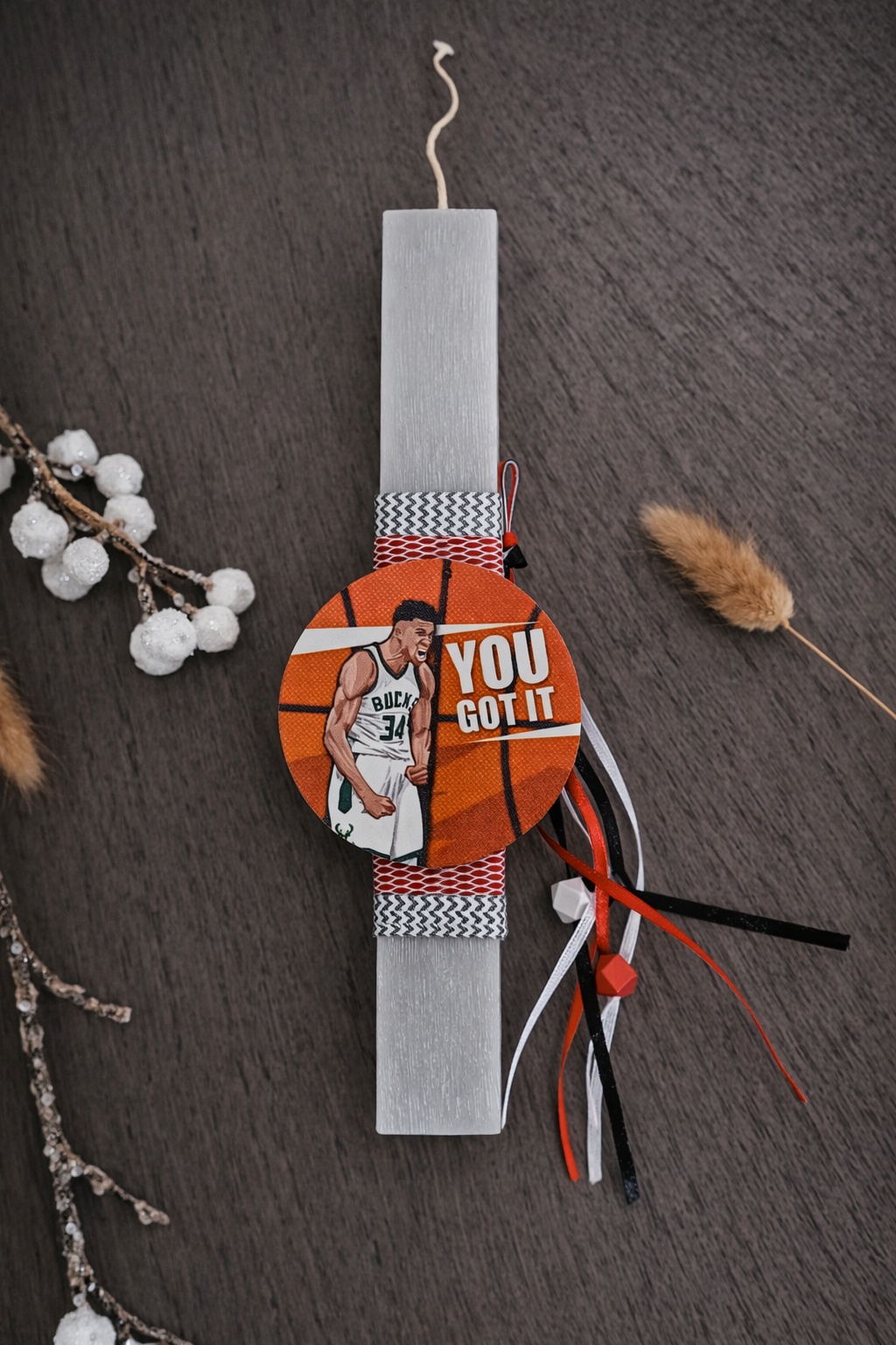 Χειροποίητη παιδική λαμπάδα Αντετοκούνμπο με minimal σχεδιασμό. Ιδανική για μικρούς φανς μπάσκετ και αθλητές. Μοναδικό δώρο Πάσχα για champions!
